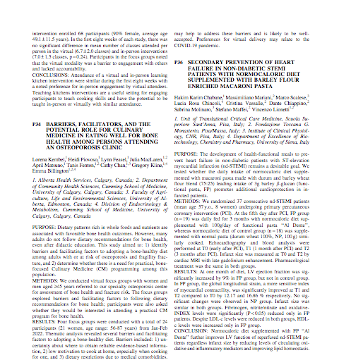 PURPOSE: The development of health‐functional meals to prevent heart failure in non‐diabetic patients with ST‐elevation myocardial infarction (nd‐STEMI) remains a desirable goal. We tested whether the daily intake of normocaloric diet supplemented with macaroni pasta made with durum and barley wheat flour blend (75:25) leading intake of 3g barley β‐glucan (functional pasta, FP) promotes additional cardioprotection in infarcted patients. METHODS: We randomized 37 consecutive nd‐STEMI patients (mean age 57 y.o., 8 women) undergoing primary percutaneous coronary intervention (PCI). At the fifth day after PCI, FP group (n = 19) was daily fed for 3 months with normocaloric diet supplemented with 100g/day of functional pasta “Al Dente”, whereas normocaloric diet of control group (n = 18) was supplemented with normal pasta (durum wheat 100%, NP, 100 g) similarly cooked. Echocardiography and blood analysis were performed at T0 (early after PCI), T1 (1 month after PCI) and T2 (3 months after PCI). Infarct size was measured at T0 and T2 by cardiac MRI with late gadolinium enhancement. Pharmacological treatment was the same in both groups. RESULTS: At one month of diet, LV ejection fraction was significantly increased by 9% in FP group, but not in control group. In FP group, the global longitudinal strain, a more sensitive index of myocardial contractility, was significantly improved at T1 and T2 compared to T0 by 12.17 and 16.86 % respectively. No significant changes were observed in NP group. Infarct size was similar in both groups. Fibrinogen, nitrite/nitrate and oxidative‐INDEX levels were significantly (P < 0.05) reduced only in FP patients. Despite LDL‐c levels were reduced in both groups, HDL‐c levels were increased only in FP group. CONCLUSION: Normocaloric diet supplemented with FP “Al Dente” further improves LV function of reperfused nd‐STEMI patients regardless infarct size by reducing levels of circulating oxidative and inflammatory mediators and improving lipid homeostasis.| File | Dimensione | Formato | |